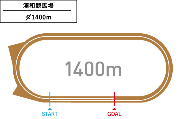 1400mは浦和で最も多くレースが組まれている舞台で、フルゲートは12頭。1周は1200mで、4コーナー付近からスタートして4回コーナーを通過し、馬場を1周+200m。逃げ馬が揃うと1コーナーまでの先行争いが激しくなり、ハイペースになることも。ゴールまでの直線は約220mで、南関東の中では最も短い。