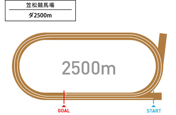 笠松競馬場は1周1100mで、ゴールまでの直線は201m。1.92mの高低差は、地方の競馬場では盛岡に次ぐもの。2500mは1400mと同じ4コーナーポケットからのスタートで馬場を2周する。小回りでコーナーが8回と多いため基本的には先行馬が有利だが、2周目3コーナーあたりからのペースアップに対応できる瞬発力がないと勝ち切ることは難しい。