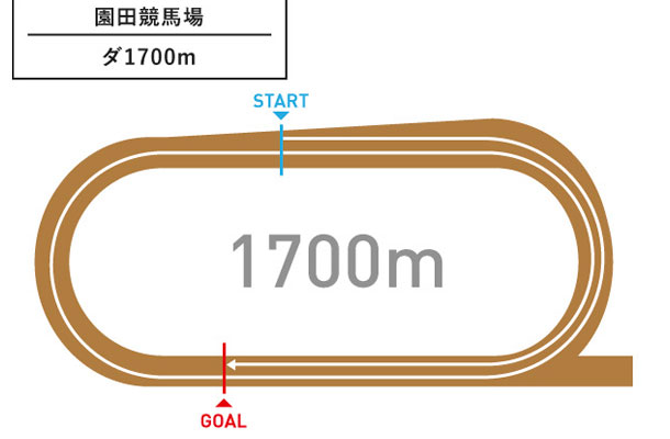 園田競馬場(右回り)は20年の馬場改修で白い砂に入れ替えられた。1周1051mは現存する地方競馬場ではもっとも小さく、ゴールまでの直線も213mと比較的短い。1700mは向正面中ほどが発走地点で、3コーナーまでの距離が短い。3〜4コーナーは緩やかなスパイラルカーブが採用されており、スピードを落とさず直線に入ることができる。その3コーナー手前あたりが勝負どころで、一気にレースが動くことが多い。