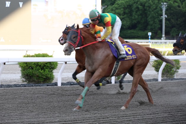 母がオトリコミチュウで兄が高知でも活躍したチョメチョメ(現浦和)。JRA1勝クラスから昨秋に移籍してきた時には内田玄祥オーナーらしい面白い馬名の一頭といったイメージにすぎなかったが、3戦目に当地初勝利を飾るとそこからあれよあれよの6連勝と大出世を果たしている。特に黒船賞の選考競走である大高坂賞、だるま夕日賞はペース的にも全く異なるレース展開だったが難なく対応し快勝。名実ともに地元勢の代表格となった。最大の武器は永森大智騎手が再々、口にする「操縦性の良さ」。更に明けて4歳になったばかりの若馬でもありどこまで成長するのか計り知れない面がある。先々の展望も含め、実り多きチャレンジとなることを期待したい。