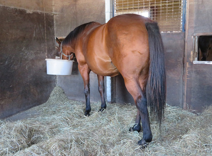 私がおじゃました時、イケノエメラルドはちょうど放牧を終えて馬房でのんびり過ごしていました。その後にカイバを食べていたのですが、お尻を向けると、迫力たっぷりの体には圧倒されてしまいました。21歳のおばあちゃんですが、毛づややハリは抜群で、健康体なんだろうなと。長生きして欲しいですね。