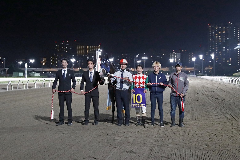 しかし、決着はあっさりついた。直線に向き、ママママカロニが持ったまま1馬身ほど前に出ると、ややモタれながらも一気に脚を伸ばす。残り200メートル付近で早くも3、4馬身差。その後も脚いろは衰えず、ゴールでは9馬身差をつける圧勝で、今年最初の南関東2歳重賞を制した。
