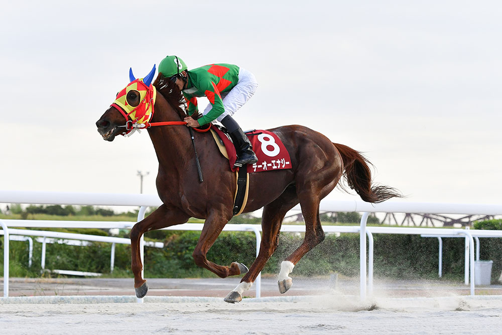 そのなかで注目を集めたのが、兵庫からの遠征馬、テーオーエナジー。JRA所属時に兵庫チャンピオンシップJpnIIを制し、オープン特別を2勝した実績は断然だ。心配点といえば、2019年3月以降がすべて6着以下という近況と、移籍初戦での遠征競馬。最終的には単勝1.3倍になったが、そのあたりが約1年ぶりの前走を快勝したヒルノデンハーグも3.1倍の支持を得た要因だろう。しかし3番人気はエネスクで21.3倍。上位2頭に人気が集中する形でレースを迎えた。