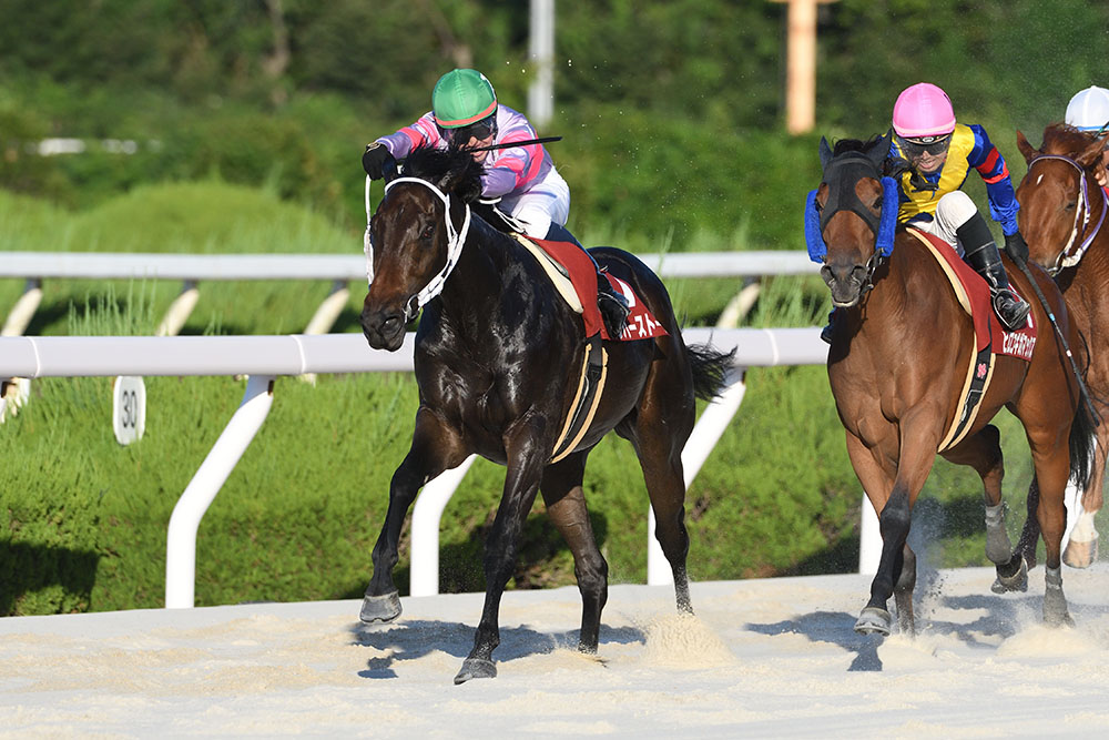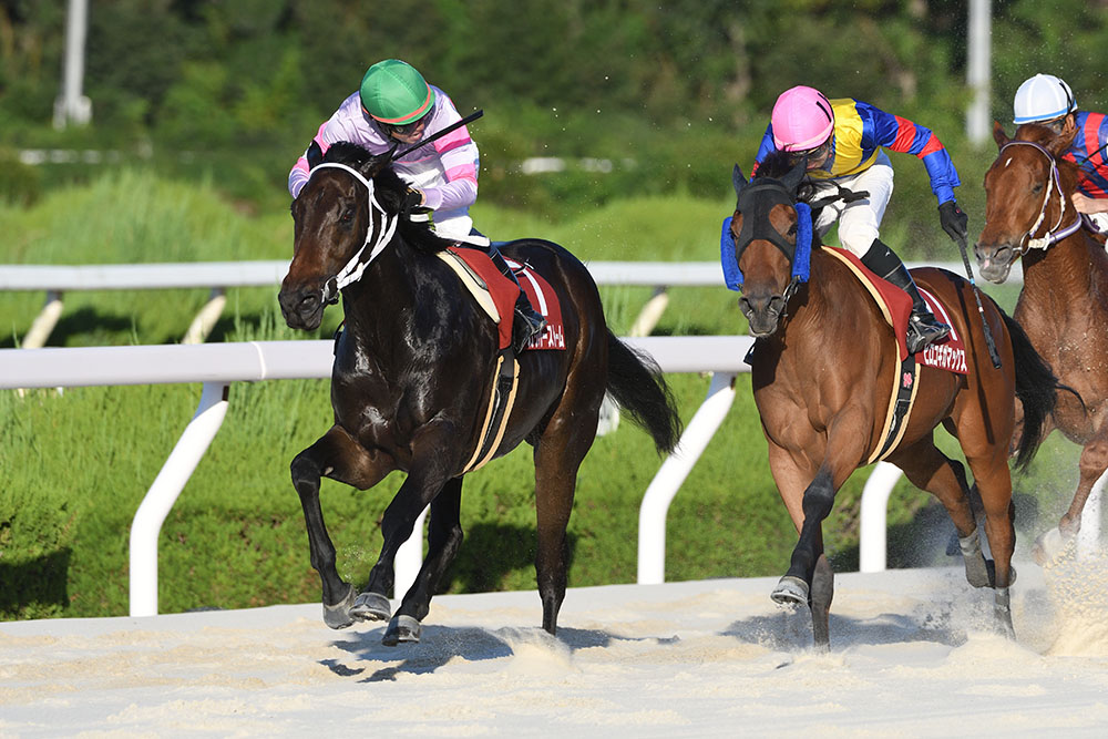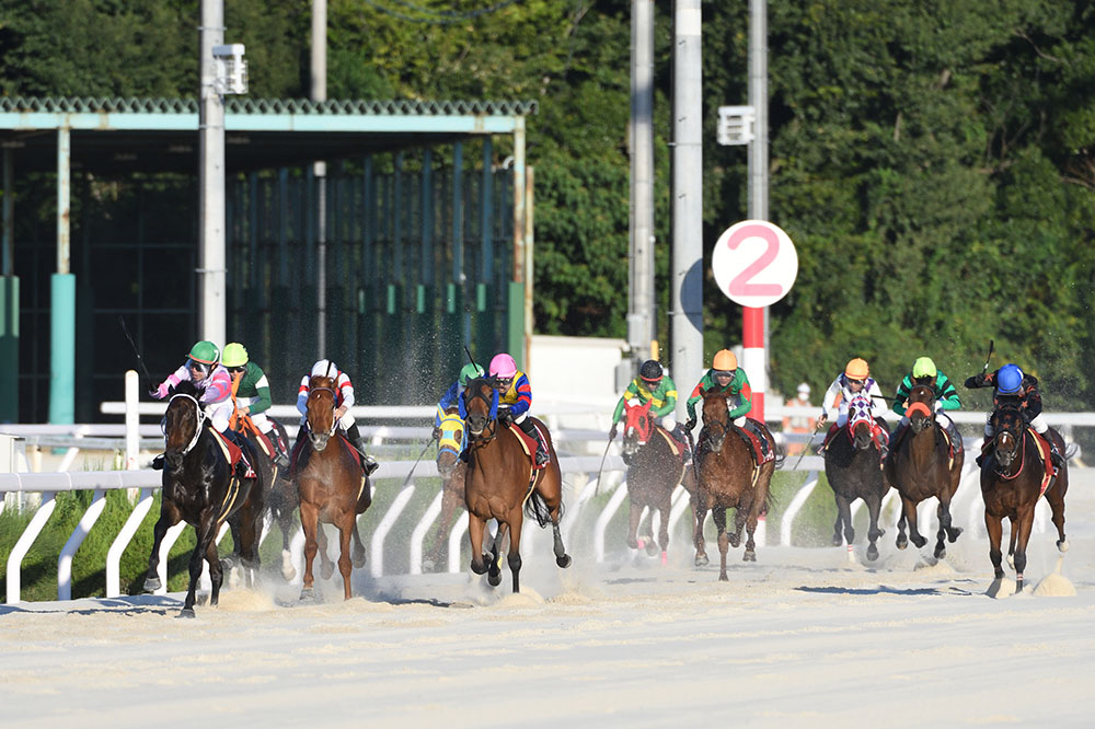 注目のガリバーストームは、他馬の枠入りの遅れで待たされ、隣の馬が落ち着かない素振りを見せるなど不安なシーンもあったが、ゲートが開くと、好位2番手の外にぴったりとつけた。内から逃げたのは4番人気のアンサン。「経験の浅い2歳馬。砂をかぶるより、行った方がいいと思ったので。マークはされますが、あとは力比べですから」と松木大地騎手。ベラジオボッキーニは3番手、ウーニャは中団を追走した。
