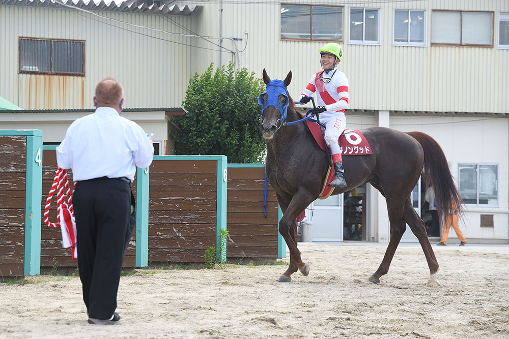 対して、「もう1頭の高知勢にも差されてしまいました。ダノングッドに交わされて、なんとか2着を、と思ったのですが」と悔しい表情を見せたのはブレイクフリーの下原理騎手。「でも、820メートルでこの馬は強いですね」と、これまで4戦2勝、2着1回だったこの舞台への適性を示した。