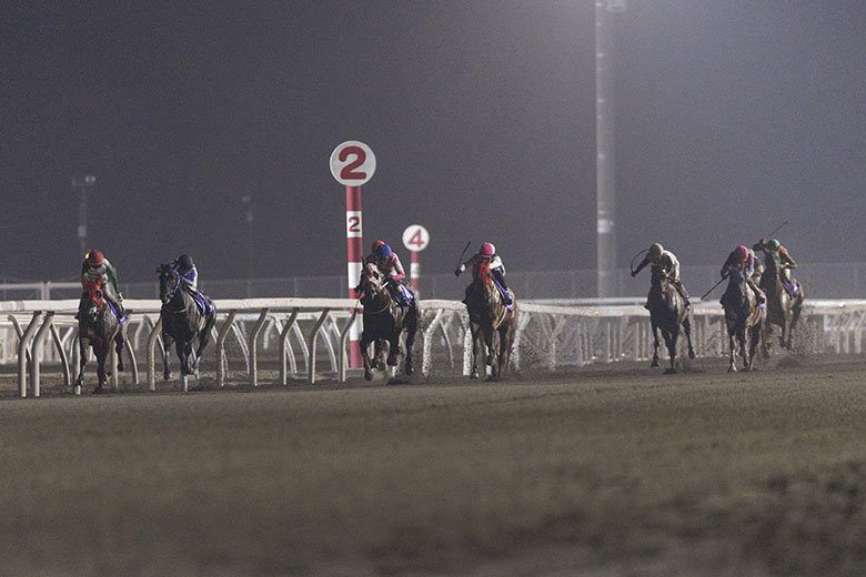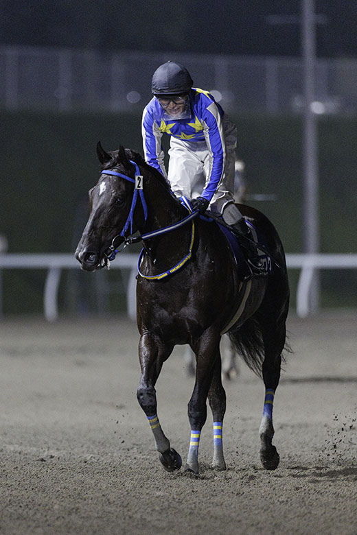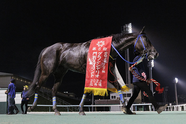 青鹿毛の馬体がナイトレースの照明に美しく映えた。桑村真明騎手はほっとした表情で戻り、オーナーであるオリオンファームの三浦啓一場長に声をかけられ指を3本立てた。片平陽子厩務員は「あーよかった」と馬をたたえた。