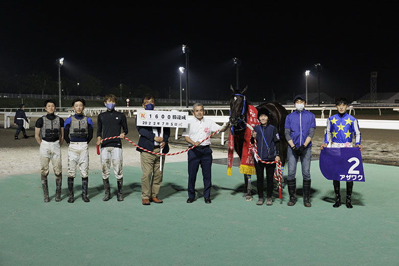 角川秀樹調教師は同時に通算1600勝(中央も含む)を達成。三浦場長が記念プレートを持ち、所属の阿部龍騎手らも加わるなどホッカイドウ競馬らしい写真撮影となった。今後についてはオーナーサイドと検討すると角川調教師は話した。