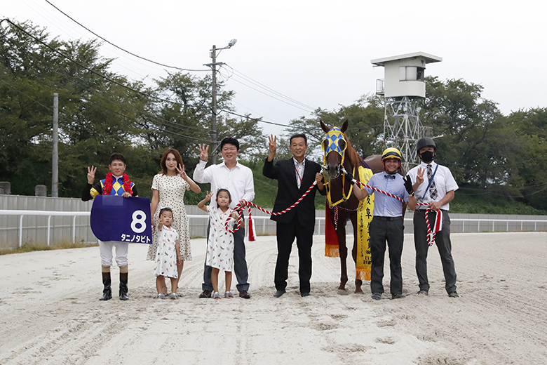 レース後、表彰式の場所に到着した岡部騎手は満面の笑顔。臨場した馬主の西村健(たけし)さんも「いやあ、ドキドキしました。これでダービーグランプリに向かえます」と話した。