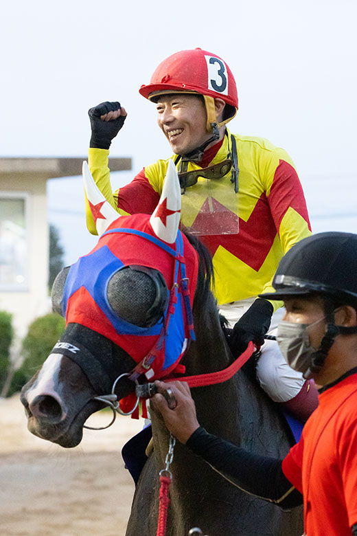 勝ててよかったです。ホッとしてます。いつもより折り合いを欠いてしまったので、馬には申し訳ないことをしたと思いました。佐賀競馬場の馬場も相変わらず乗りやすい感じでよかったです。