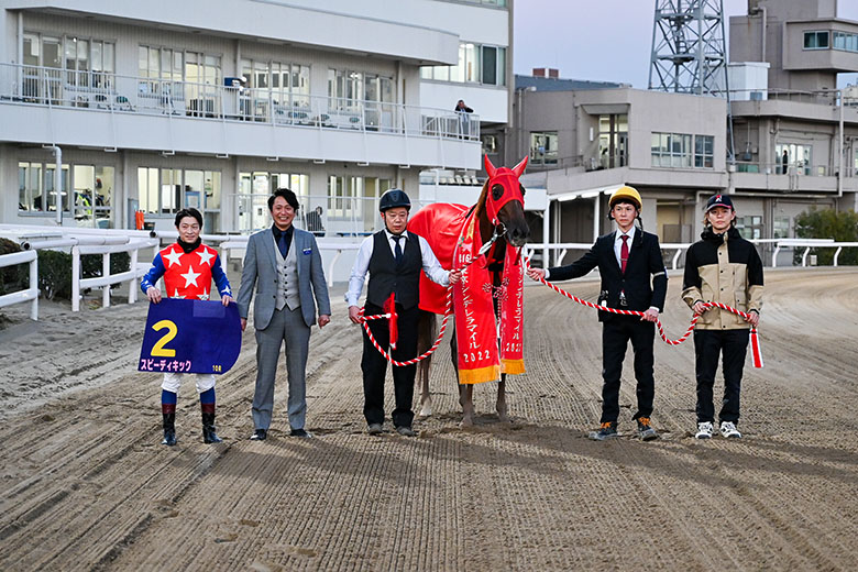 向正面では縦長となって、中団の内目を進んでいたスピーディキックだったが、3コーナー過ぎで外に持ち出されると一気に進出。4コーナーでは「来たぞ!来たぞ!外からスピーディキック」という実況とともに抜群の脚色で前をとらえにかかる姿がビジョンに映し出されると、ファンからワッと歓声が上がった。