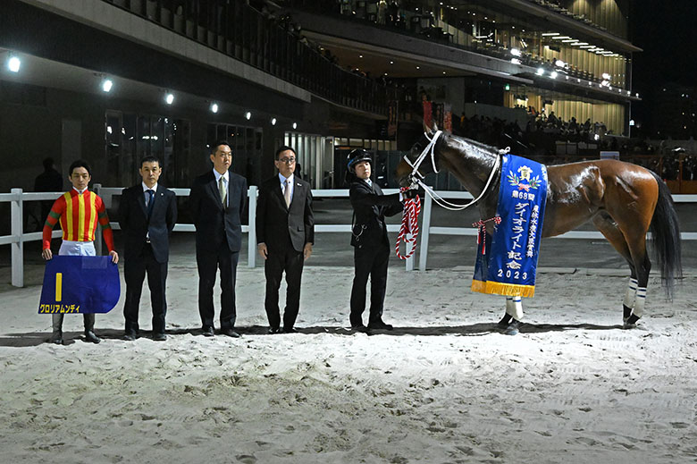 その一歩後ろの7番手で折り合いをつけたグロリアムンディは、2周目の向正面で進出を開始。団子状態となっていた先行勢をどうさばくか注目が集まったが、川田騎手はガラッとあいた内を選択すると、直線の入口で一気に先頭へ。そのままグロリアムンディは最後まで脚を伸ばし、9馬身差で重賞初制覇を飾った。
