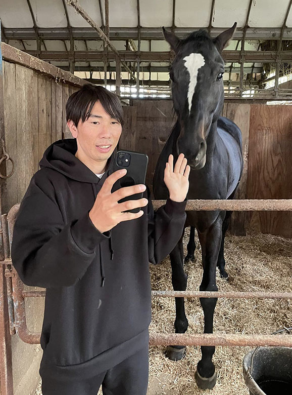 今回は真島調教師からお写真を提供して頂きました。引退してからもなお、かつてのパートナーに会いに行き自撮りする関係性がすごく素敵だなぁと、ホッコリ。