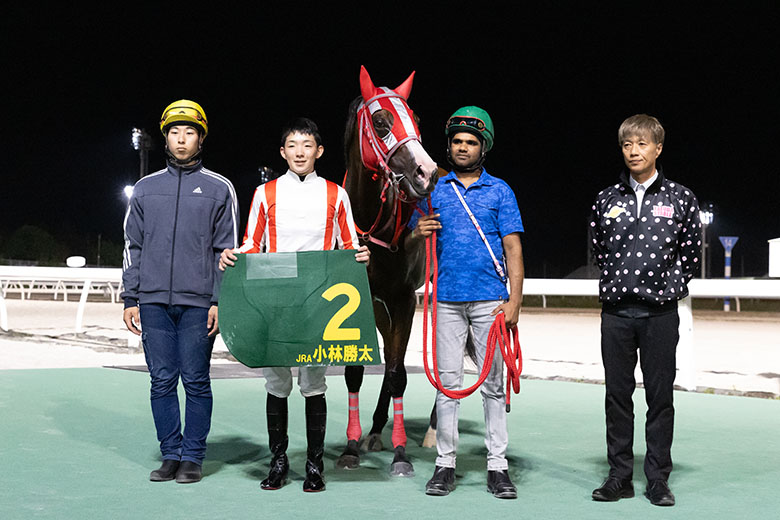内枠からすんなり先頭に立ったのは小林騎手のハーディネス。レースは淡々と流れ、4コーナーでも手応えは十分なまま。宮内騎手、内に若杉朝飛騎手、外に阿岸騎手と、地元騎手3名がほぼ横一線となって追いかけたが、小林騎手はこれらを振り切り悠々と先頭でゴール。