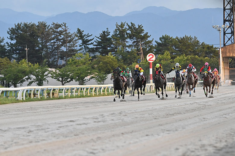 直線を向いても前2頭の位置関係は変わらず。しかし競り合ったぶん、直線半ばでやや脚が上がり、3コーナー過ぎで単独3番手に位置取りを上げたグランパラディーゾに、ジュランビル、さらにうしろから追ってきたクリノメガミエースらがゴール前で一気に迫った。