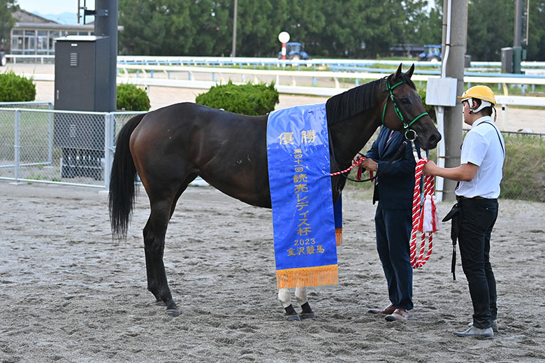 それを差し返して2着に健闘したアンティキティラは、昨年3歳時は他地区への遠征で活躍したが、4歳になった今年は苦戦が続いて今回は6番人気という評価。前走牝馬の準重賞・ヴェガ特別で久々に2着に好走し、「調子はよかった」と言う別府真司調教師だが、台風で通行止めの可能性があり、1日早く金沢に移動するよう主催者から要請があり、その影響で17キロの馬体減が残念だったとのこと。