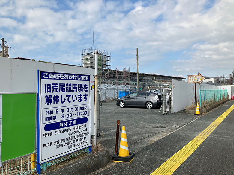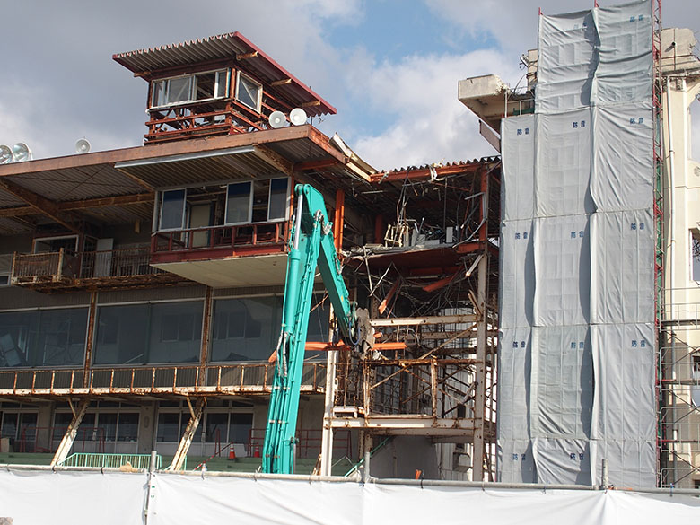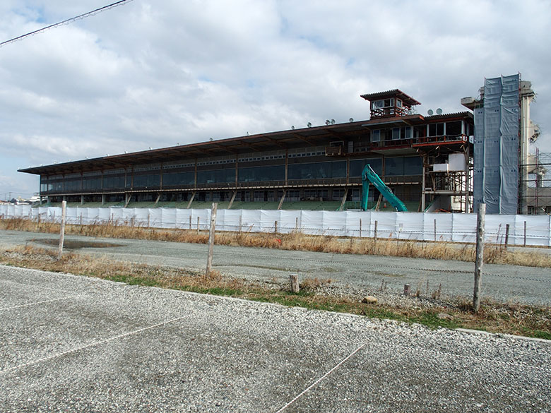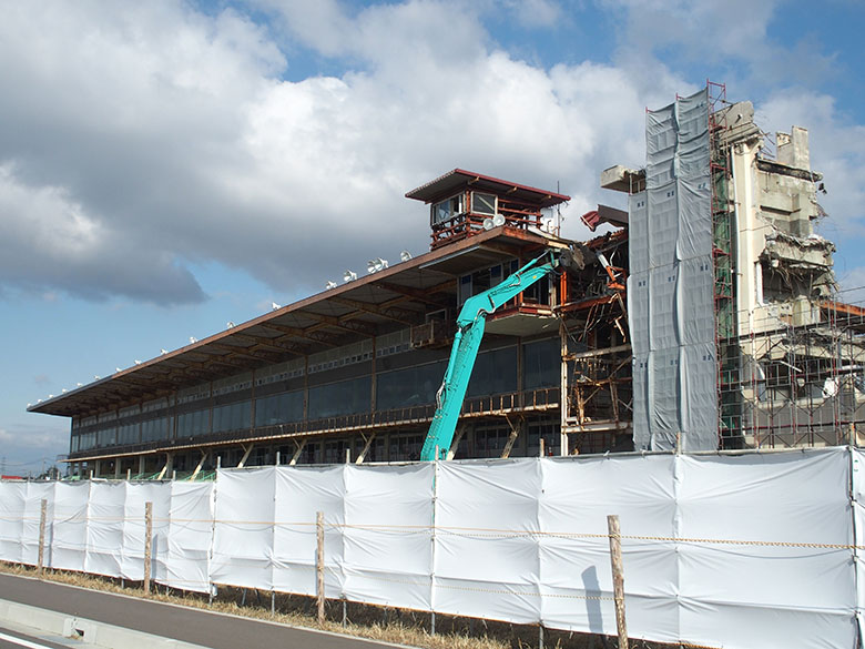 そこでは、スタンドの解体工事が始まったばかり。建物の大部分は残っていたものの、周りは白いフェンス(スタンドのコース側はビニールシート)で囲まれ、入場ゲートや食堂、パドックはすでに跡形もなくなっていた。