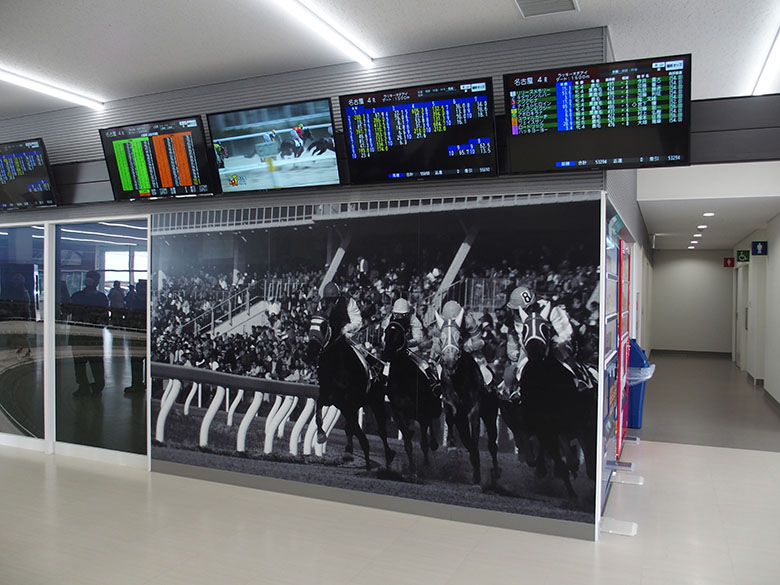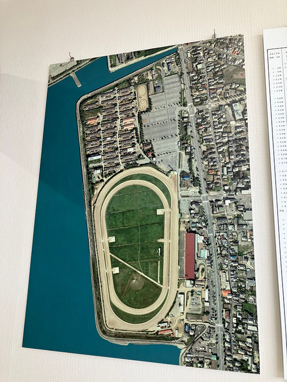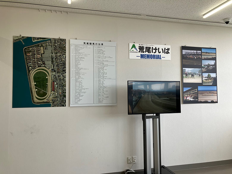 その日、BAOO荒尾では名古屋とばんえい帯広の馬券を発売していた。せっかくなのでばんえいの馬券を少々購入して施設内を見学。すると、その一角に荒尾競馬場のメモリアルコーナーを見つけた。展示されていたのは、レースや競馬場の様子などを写した写真数枚と、コース形態がわかる空中写真のパネル。それに、荒尾競馬沿革と題した年表だ。
