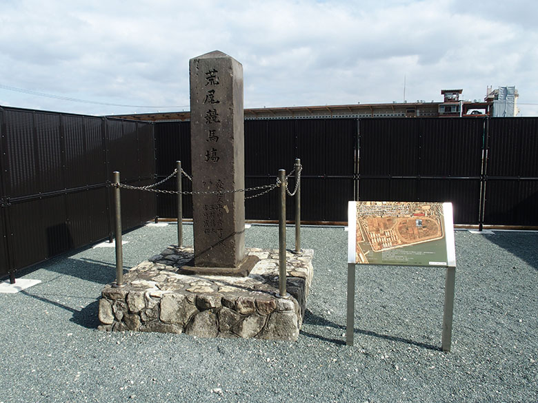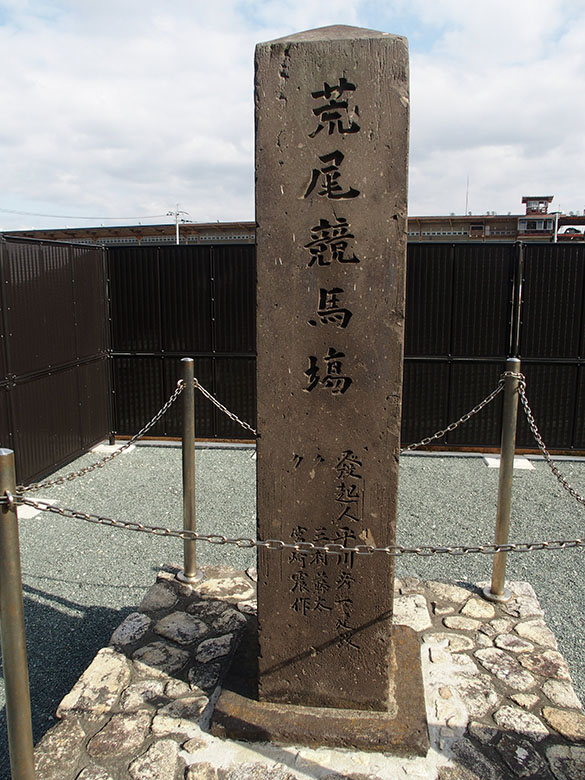 メモリアルコーナーのすぐ隣には小さな庭のような場所があり、そこに古びた石碑が建っていた。正面には「荒尾競馬場」の文字と、碑を建立した発起人3名の名前が刻まれている。これは1928(昭和3)年の競馬場開設を記念して建てられたもの、とのこと。初めは競馬場の内馬場にあったが、後にパドック付近に移され、BAOO荒尾オープンにともなって再移設されたそうだ。“ゲートアーチ”にメモリアルコーナーに開設記念の石碑。競馬場の名残がこんなに見られるBAOOは他にないかもしれない。