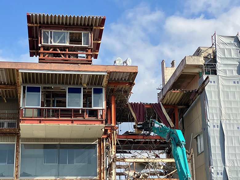 BAOO荒尾でしばらく過ごした後、かつてのコース側からスタンドを眺めに行った。白いビニールシートの内側では、巨大な重機が容赦なく建物を解体していた。恐竜の口を思わせる重機の先が引きちぎっていたのは、かつて決勝審判室や記者席、さらには実況席があった部分だった。