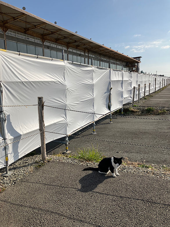 1月の“探訪”から約半年、23年6月末に別の用事で熊本に行った際、再度“現場”を訪れてみた。すでにスタンドや「荒尾けいば」と書かれた標柱などの解体、撤去は完了していた。巨大な建造物がなくなって、競馬場裏の国道からは遠くの景色がよく見えたが、あの猫の姿は当然ながら(?)見当たらなかった。