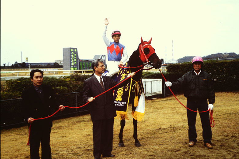 思い出の騎乗馬を1頭あげるとすればトビアラシですね。私がデビューした頃にオープンで活躍した馬で、後方からひとまくりして勝つというのがパターン。馬が勝負どころを覚えているみたいで、後ろのほうを走っていても3コーナー手前で外に出すと4コーナーではもう2、3番手。直線で楽に抜け出して勝ってしまう。ふだんは腰がフラフラして倒れそうな馬なのに、レースに行ったら違うんです。当時の馬場で上がり34秒、1400メートル戦のレコードを作ったこともありました。