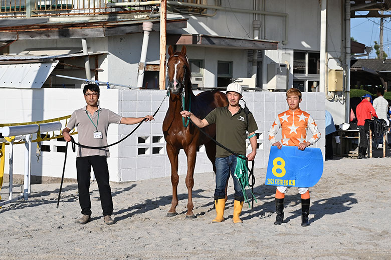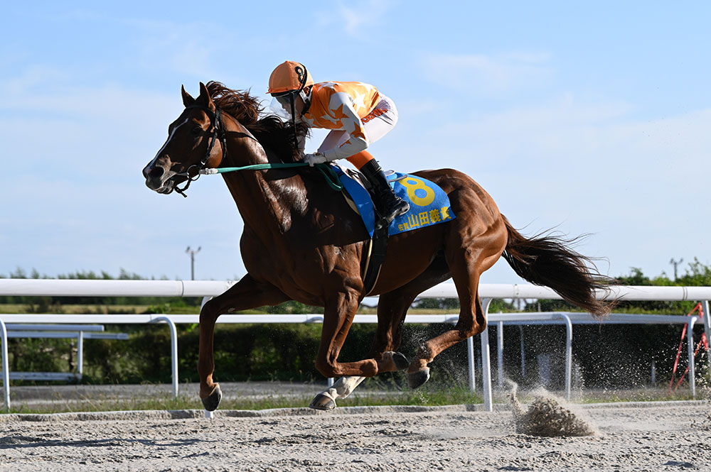 レースはその田口騎手が引っ張った。深澤騎手や、是が非でも勝ちたい青海騎手はスタート直後に挟まれて後方から。2番手にいた山田義貴騎手(佐賀)が4コーナーで先頭に並びかけると、直線ではリードを広げて3馬身差で勝った。