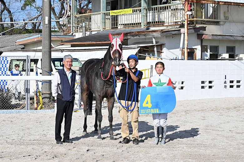 2~4着は写真判定の末、2着に3~4コーナーをロスなく6番手で回った長尾騎手。開口一番に「これでファイナルに行けますよね?」と、ピースサインを作って喜んだ。「TR園田第2戦でのハナ差2着が本当に悔しくて、毎日レース映像を見返しては反省していました」と、ようやく気持ちが晴れたよう。