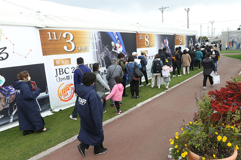 3年前、コロナ禍で初めて開催されたJBCは今回と同じ大井×門別。入場制限や取材規制を敷いて厳戒態勢の中で行われたことを思い出す。当時、大井では事前応募による抽選で、発表された入場は777人。あれから3年が経ち、制限がなくなった今年は開門前からたくさんのファンが行列を作ったため、当初の予定よりも10分早い9時40分に開門となった。開門時の入場者数は約1900人で、最終的な入場者数は2万4506人。門別競馬場ではJBC初開催だった2020年から昨年まで入場制限が行われ、2020年240人、2021年667人、2022年842人と推移してきたが、今年は制限なしで2606人が来場した。