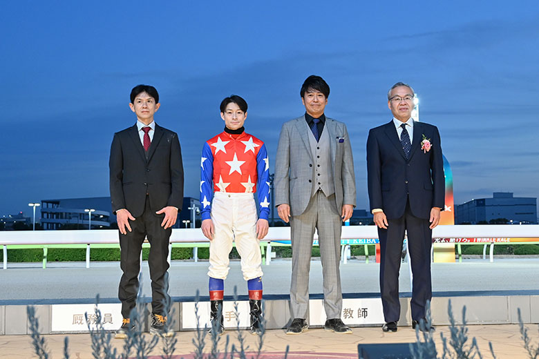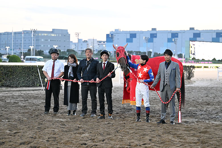 アクシデントにも怯まず貫録の走りで2連覇を飾ったスピーディキック。「精神的にも成長を感じますし、今年は強い馬と戦ってきてタイトルを獲らせてあげられなかったので、最後に勝ててほっとしています」と御神本訓史騎手は胸をなでおろした。「4コーナーで振られたときにおそらく自分の脚が当たって出血をしていました。ただ普通の馬だったらあの段階で心が折れるはず。精神面の強い馬です」と藤原調教師はケガの様子について心配しながらも、この馬の強さを改めて感じているようだった。