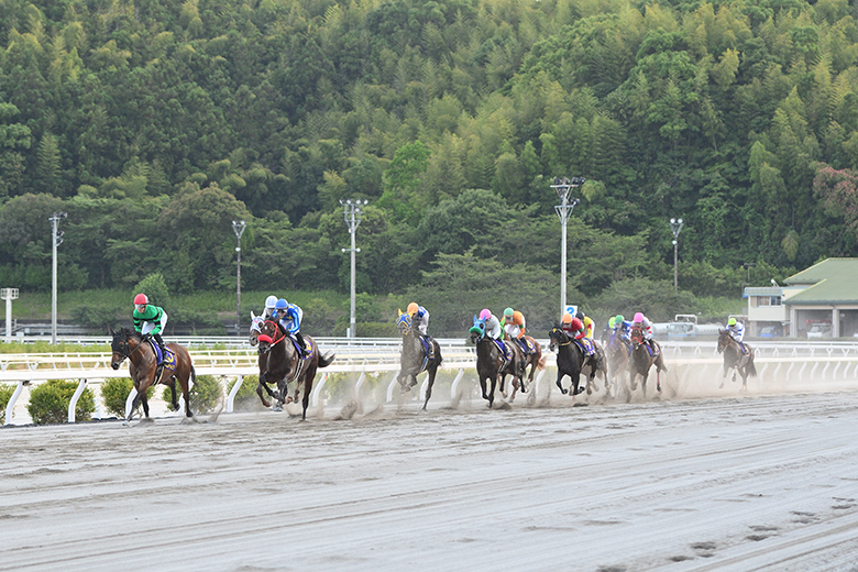 今年で52回目を迎えた高知優駿。10頭の高知所属馬と2頭の遠征馬が、良馬場の1900メートルを舞台に覇を争う。単勝1.2倍の1番人気に推されたのが、7連勝中のプリフロオールイン。一冠目の黒潮皐月賞に続いて二冠制覇を目指す。県内外の重賞・準重賞で上位を争うワンウォリアーが2番人気、浦和の重賞ホース・アムクラージュが3番人気に支持された。