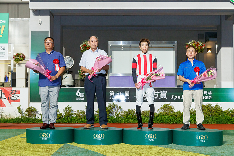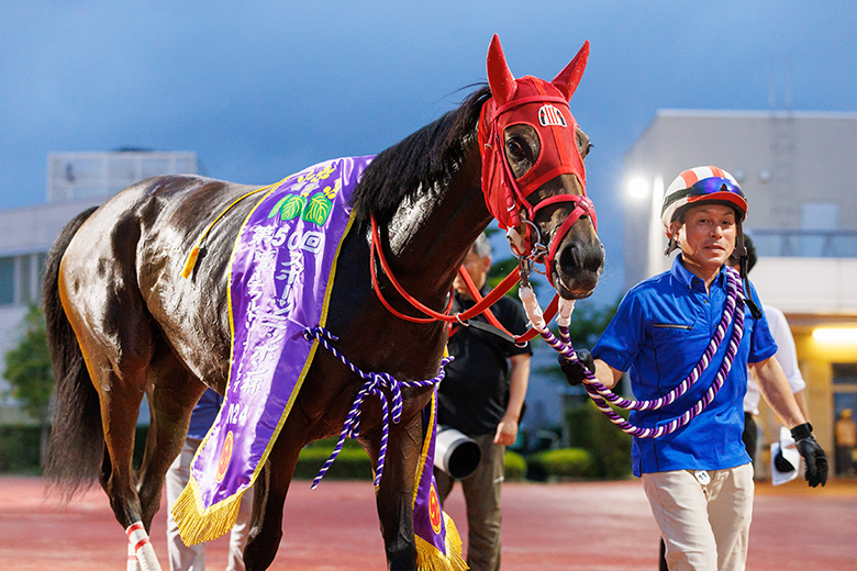 それもそのはずで、この勝利は、2010年マイネベリンダ以来、14年ぶりの岩手所属馬の優勝という大金星。ミニアチュール自身は約1年ぶりの重賞勝利という復活劇となったのだ。3歳時に重賞7勝をあげ、世代のトップホースに君臨したが、古馬との戦いになってからは苦戦が続いた時期もあった。「このまま終わりなのかなと思うこともありましたが、うまく立ち直ってくれました。短い距離を使ったことがきっかけにはなったと思います。今日は牧場さん(下河辺牧場)の血の繋がりも強く感じましたね」と佐藤祐司調教師は安堵の表情で語った。続けて、「交流レースを勝てたことで、不来方賞の瀬戸先生(フジユージーン)にもいい流れをバトンタッチできたかな」とほほ笑んだ。