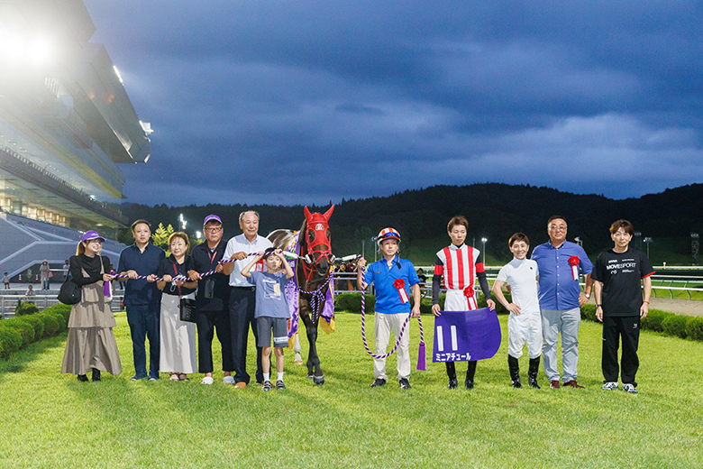 「やったー!」と笑顔で戻ってきた佐々木志音騎手とミニアチュール。周囲から促されるようにウィニングランに向かい地元ファンの歓声に応えた。そして再び帰ってくると関係者が佐々木騎手を囲み「すごい、すごい!」と大喜びの祝福ムードに包まれた。