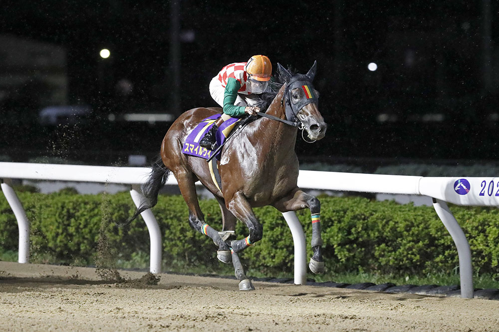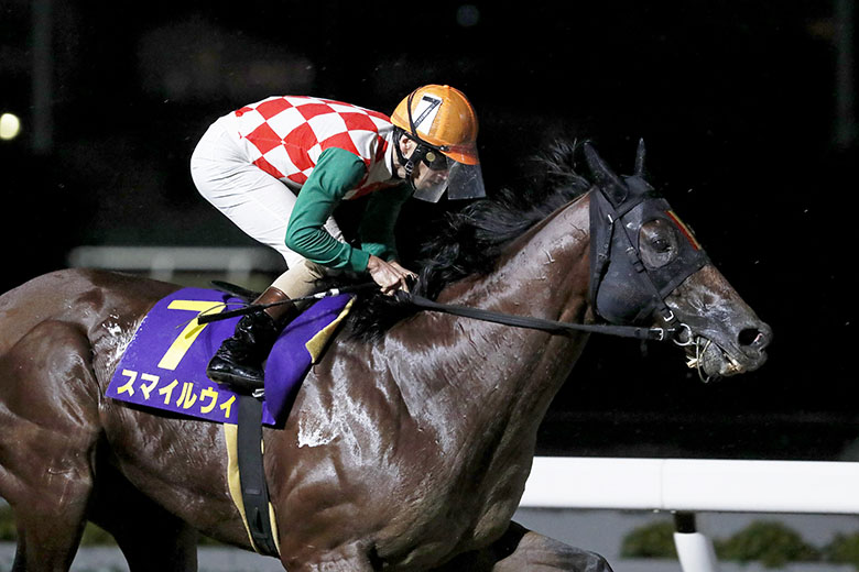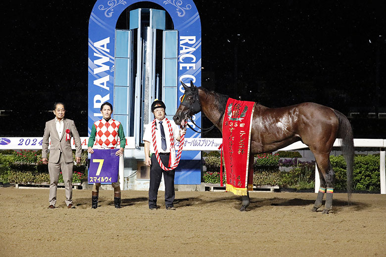 浦和1400メートルのスペシャリスト、スマイルウィが底力を見せつけた。これで重賞7勝目、待望のダートグレード初制覇だ。ここまで、昨年のさきたま杯JpnIIがクビ差、テレ玉杯オーバルスプリントJpnIIIでは3/4馬身差でともに2着とタイトルまであと一歩。「悔しいレースが続いていたので、起死回生の一発と思っていました。嬉しいですね」と張田京調教師も感慨深い表情を見せた。