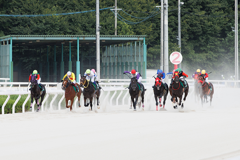 向正面から3コーナーにかけて、岩田騎手と後続の差がじわじわ詰まっていく。4コーナー、下原騎手と山本騎手が競りながら先頭に並びかける。直線、『岩田・下原・山本』が横並びで、火の出るような叩き合い!1着争いはこの3人に絞られたか、と思いきや……。