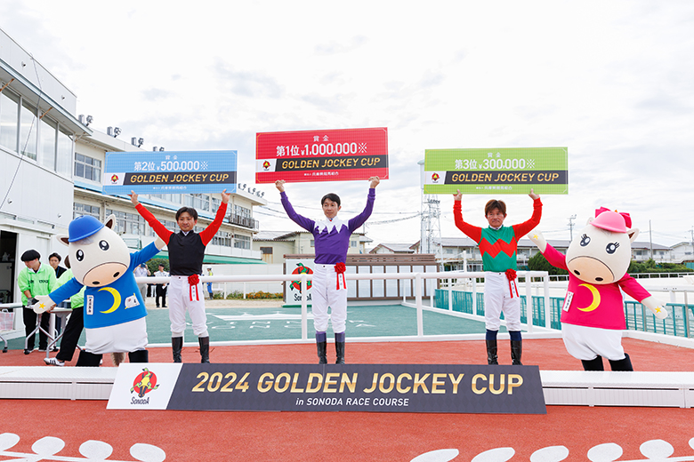 第2戦エキサイティングジョッキー賞は、吉村騎手&ベラジオサキが大外から力強く脚を伸ばして1着。武騎手が1馬身差の2着に食い込み、高知の赤岡修次騎手がクビ差の3着に粘り込んだ。吉村騎手がベラジオサキとコンビを組むのは3度目だった。
