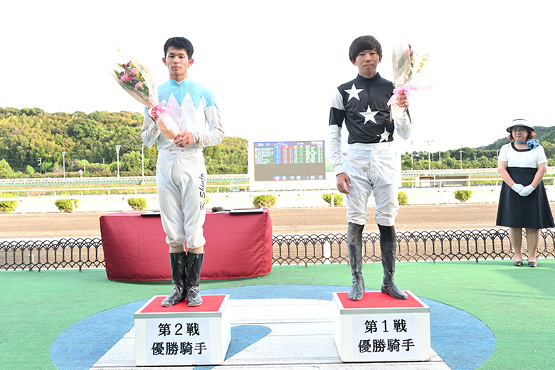 第2戦は地元高知の阿部基嗣騎手がレースを引っ張る中、ゴール直前で差した新庄海誠騎手(兵庫)とサーブルミラージュが勝利。地方競馬教養センターに一度は入所しながらも中退し、その後の厩務員時代には12連勝で重賞・摂津盃を制したヒダルマを担当するなど、今年4月デビューの同期の中でも人生経験豊富だ。そんな彼を「上手に乗ってくれた~」と笑顔で出迎えたのはサーブルミラージュを管理する宮川真衣調教師。2着小沢騎手の騎乗馬も管理しており、ワン・ツーでもあった。