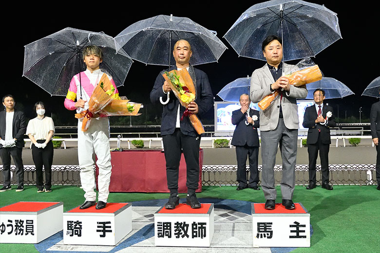 攻め馬の感触もよかったですし、初の1400メートルも問題ないと思っていました。レース中もスピードに乗っていると感じていましたが、時計を見てびっくりしました。でも道中で息が入っていましたし、これがこの馬のペースなんだと思います。今後は全国で活躍できるように、ともに成長していきたいです。