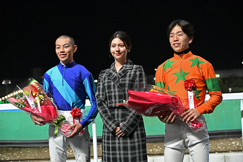 その流れをもっとも味方にしたといえるのが田中騎手。最低人気馬で先手を取って、4コーナーでは逃げ切れるかという雰囲気まであった。「根性があると聞いていました。室くんの馬がもう少し早く来てくれたら逃げ切れたかも」と笑顔。その室騎手が最後の直線で目立つ伸び脚を見せて、田中騎手に2馬身半の差をつけて勝利。「久しぶりに勝てたのでホッとしました」という結果、トライアルラウンド1位が決まった。