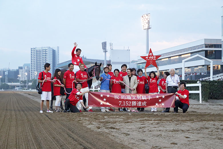的場騎手は数々の大記録を残してきたが、そのハイライトは、不滅と思われていた佐々木竹見さんの地方競馬通算7151勝の記録更新だろう。その記録更新となる通算7152勝は、2018年8月12日、地元の大井競馬第5レースで達成された。このとき61歳、翌9月7日には62歳を迎えた。2020年11月には、中央・地方を通じて騎手としては初となる黄綬褒章を受章した。