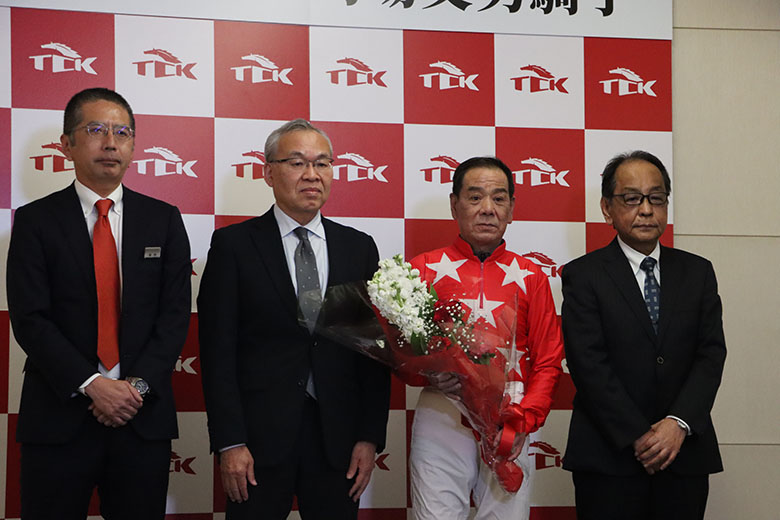 この日、的場騎手の“赤、胴白星散らし”の服色が永久保存されることも発表された。地方競馬で騎手服が永久保存となるのは、佐々木竹見氏(川崎)、石崎隆之氏(船橋)、森泰斗氏(船橋・現調教師)に続いて4人目のこと。