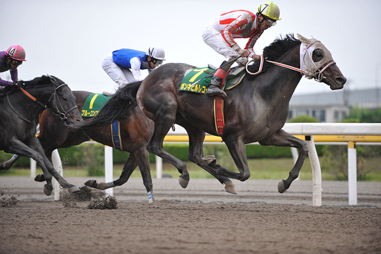 14頭立ての大外に入ったブルーファミリーはスタートで出遅れ。それでも早めに位置取りを上げ、最後の直線では単独2番手。的場騎手は見せ場をつくったが、そこまで。スタートからハナをとったプレザントが後続を寄せ付けず逃げ切り。ブルーファミリーは力尽きて5着。的場騎手は、「外枠希望でなければと思うと、その夜は悔しくて眠れなかった」と思いを語る。