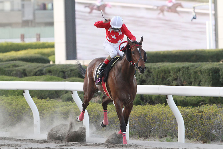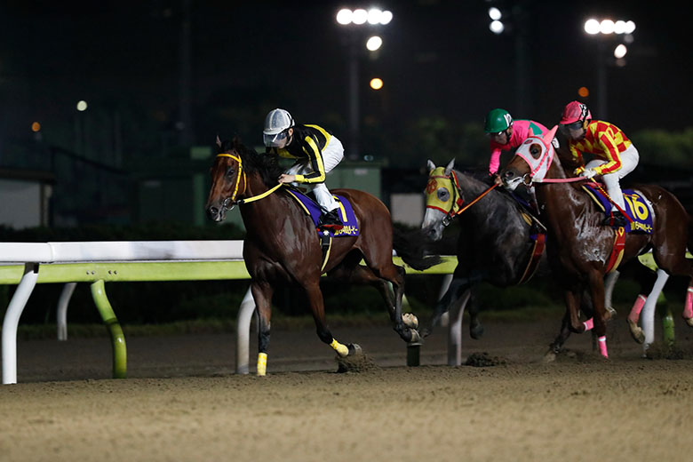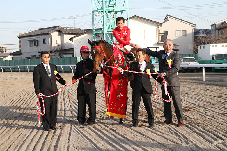 そのレースを勝ったのは、川崎の野畑凌騎手。赤に白星があるデザインの勝負服は、的場騎手の想いを引き継ぐかのような表彰式となった。