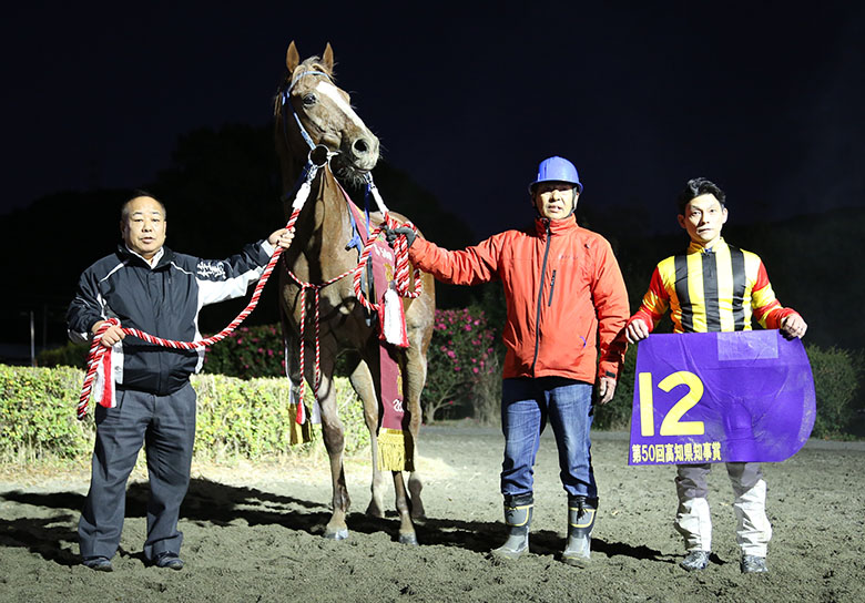 別府調教師は「うちに来た時、中央の調教師さんからは『かなり気の難しい馬だから気をつけてください』と言われていました。馬場も回らず、騎手を振り落とす仕草ばかり見せていましたが、倉兼(倉兼育康・現調教師)が辛抱して乗り続けてくれて、攻め馬もできるようになって、馬の走る気持ちも出てきました。最初から力とバネがすごくて、気の難しさがなければ、中央のオープンでも通用していたくらいの馬だったと思います」と振り返ります。