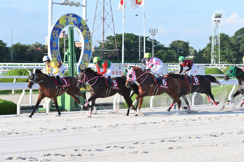 レースはいつも通り、先入れでゲートに収まった。ところが、スタートで僅かに後手を踏む。出遅れというほどではなかったが、兵庫優駿で最も緊張感が走ったシーンだったかもしれない。それでも二の脚をつけて3番手外の砂を被らない位置につけると、盤石の競馬だった。