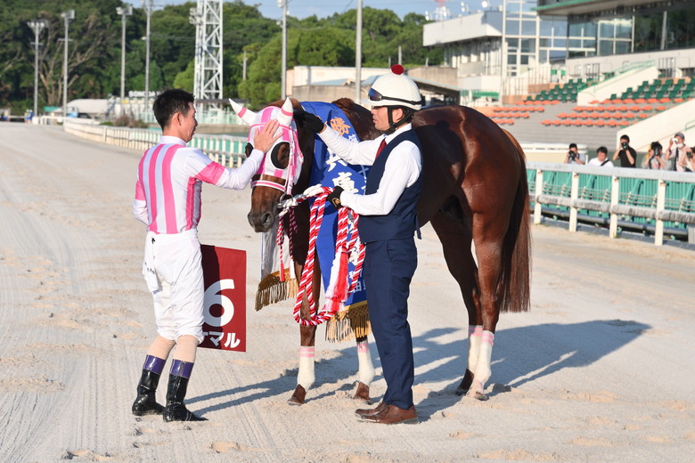 2周目向正面で先頭に並びかけ、3コーナーでは早々に先頭。4コーナー手前ではスタンドから拍手が起きるほどだった。「暑さもあってか最後はバテていました」と下原騎手は心中を吐露するが、それでも8馬身差をつけての圧勝だった。