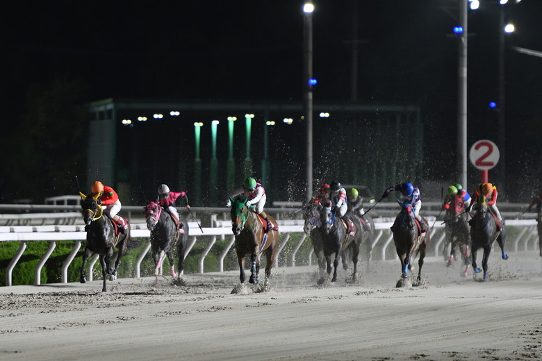 夕方の突然の大雨で良馬場から一気に不良馬場へと変わった園田競馬場は、メインレースを迎える頃には通り雨も過ぎ、ナイター競馬特有の雰囲気に包まれた。