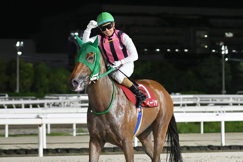 兵庫転入後の6連勝はすべて1400メートルで逃げ切りだったが、初の1700メートルで2番手に控え、重賞初制覇を飾った。