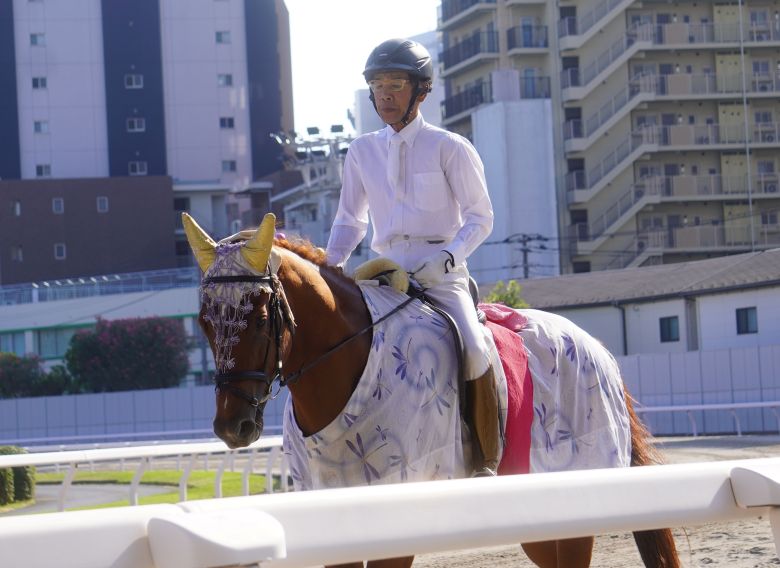 川崎競馬場の誘導馬は、さまざまな衣装を着るコスプレ誘導馬という愛称で親しまれています。フォーヴィスムはピンク色の帯をつけた浴衣姿を披露。コスプレは競馬場に来てから初めてチャレンジしたそうですが、静かに受け入れていたそうです。誘導は、ファンや関係者が見守るなか、立派に終えました。