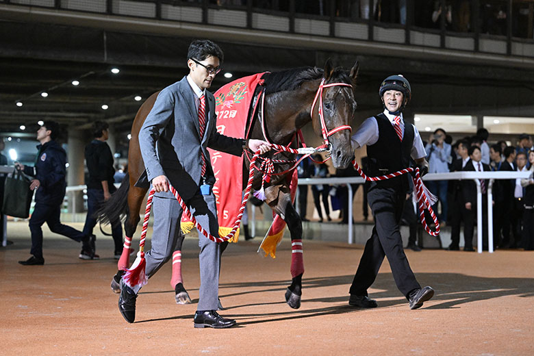2着にはレヴォントゥレットが入り、矢作厩舎のワンツーフィニッシュとなった。内から先手を主張してきたライトウォーリア(川崎)を行かせて2番手を追走。勝負どころで外からフォーエバーヤングに来られたが、最後までしぶとく食らいついた。岩田望来騎手は「勝ち馬とは手応えが違いましたね。ハイペースだったけど、よく食い下がってくれました」と厳しい流れを踏ん張ったパートナーをねぎらった。地方のダートグレードは初参戦だったが、持ち前の先行力は小回り向きで、前半の3ハロン35秒3という短距離並みの流れを粘った内容もいい。今後も全国での活躍が期待できる。