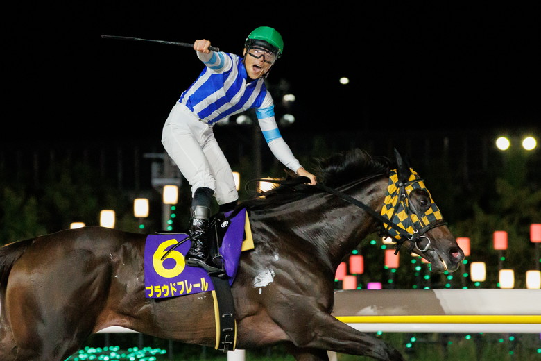 しかし4コーナーを回るとプラウドフレールは二枚腰を使って差を広げ、ゴールでは張田騎手が右手を大きく上げての逃げ切り。2着メモリアカフェには3馬身差をつけた。